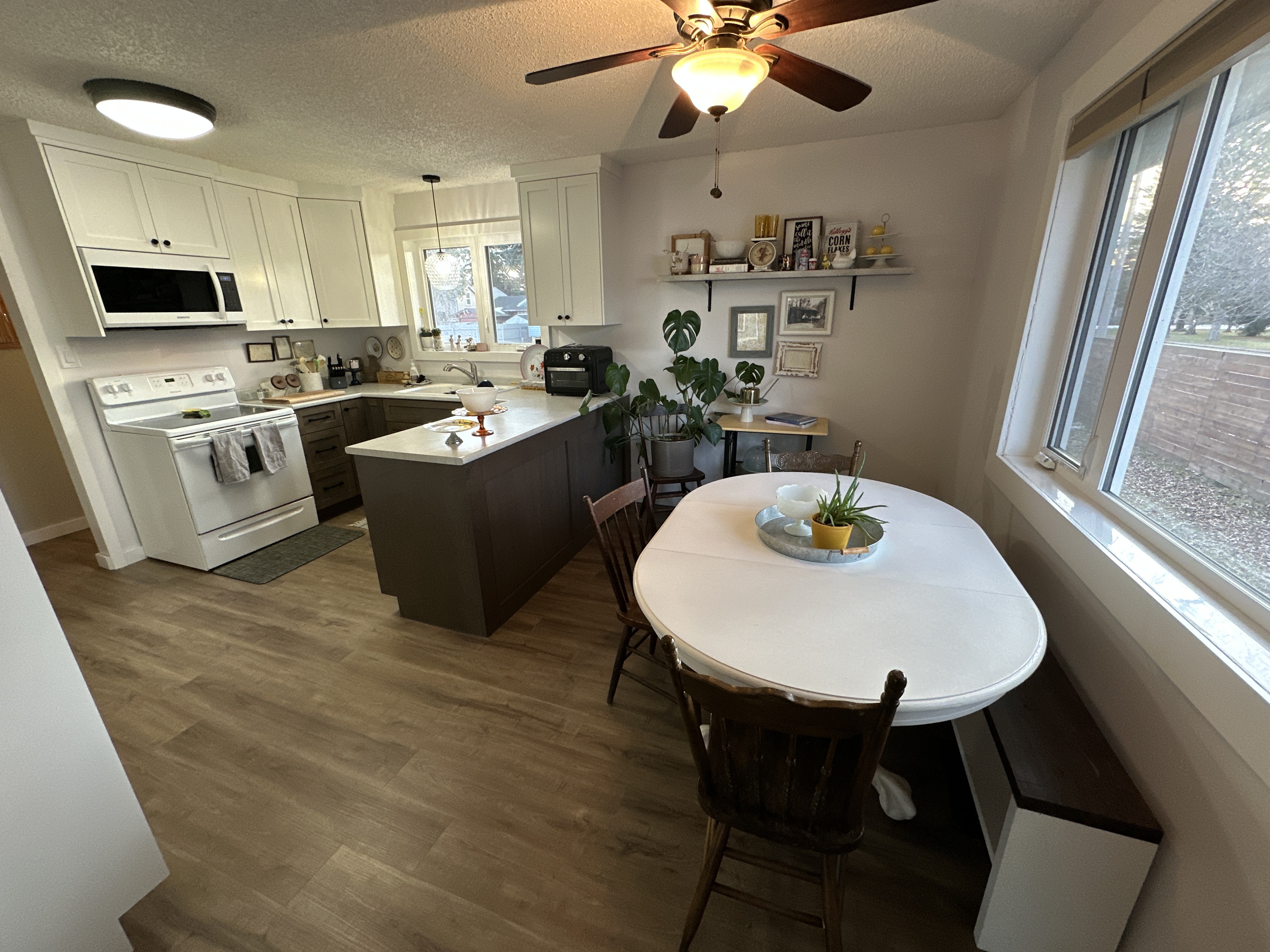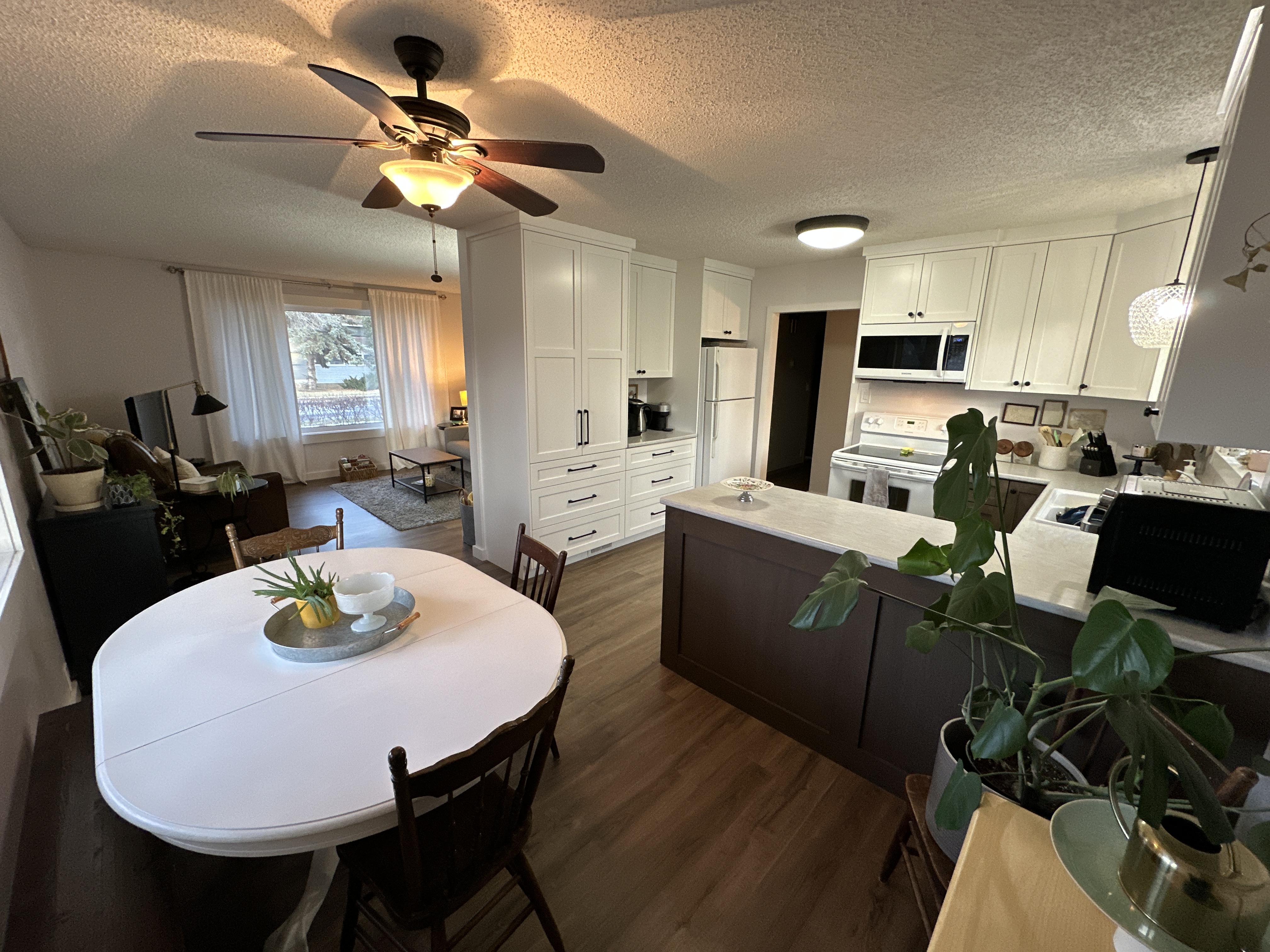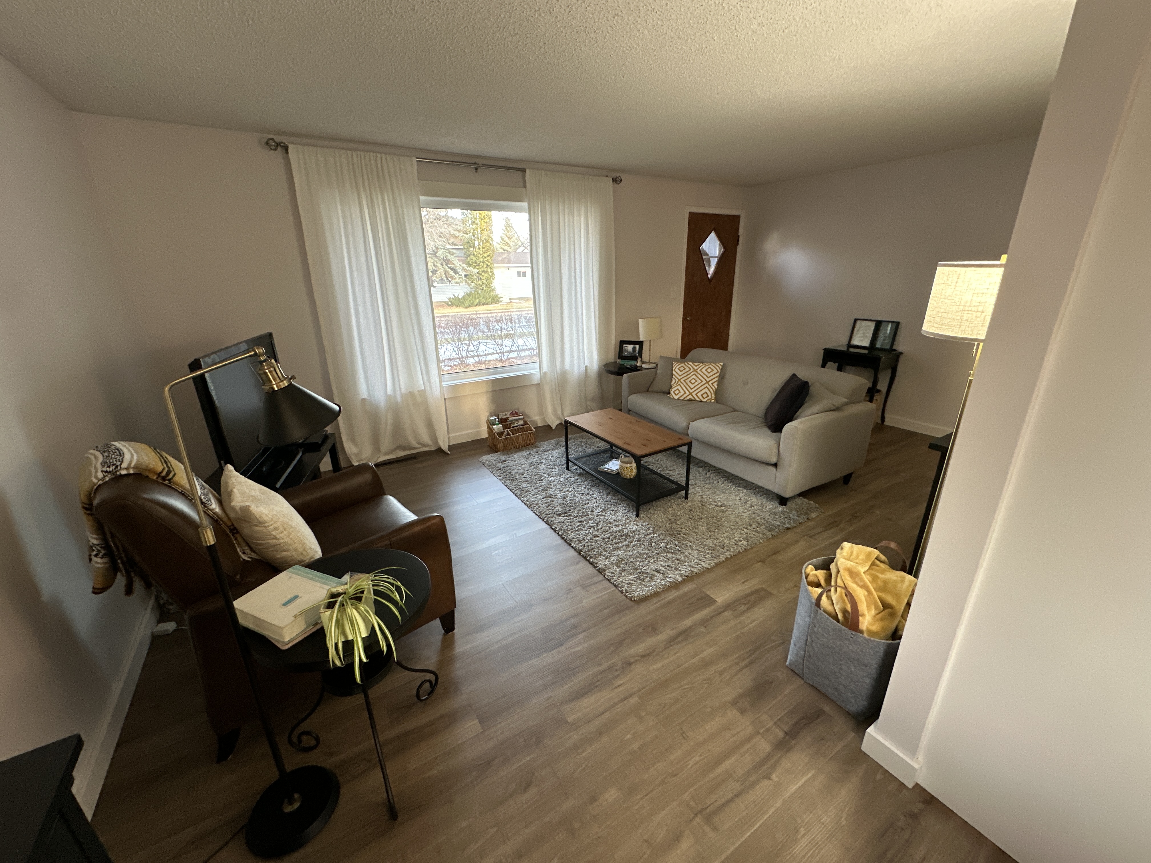 A baker’s dream is how you describe this kitchen. Welcome to this 3 bedroom and 1 bath up and 1 bedroom & 1 bath down at 1019 8th Street in Rosthern. The basement also has a spacious family room, a storage room with room for your office, and a cold storage for your garden preserves. This cozy home sits on a 100′ wide by 120′ deep lot with lots of room to add a new garage. Treed and partially fenced yard with mature trees and shrubs with a two minute walk to downtown or the rink. In summer you are close to the park and the outdoor pool, the ice cream shop and groceries. New kitchen with dishwasher & microwave in 2021, new eavestrough in 2022, fresh exterior paint in 2023. New vinyl plank flooring in the main living area also in 2021! Lots of things to mention and even more to see!